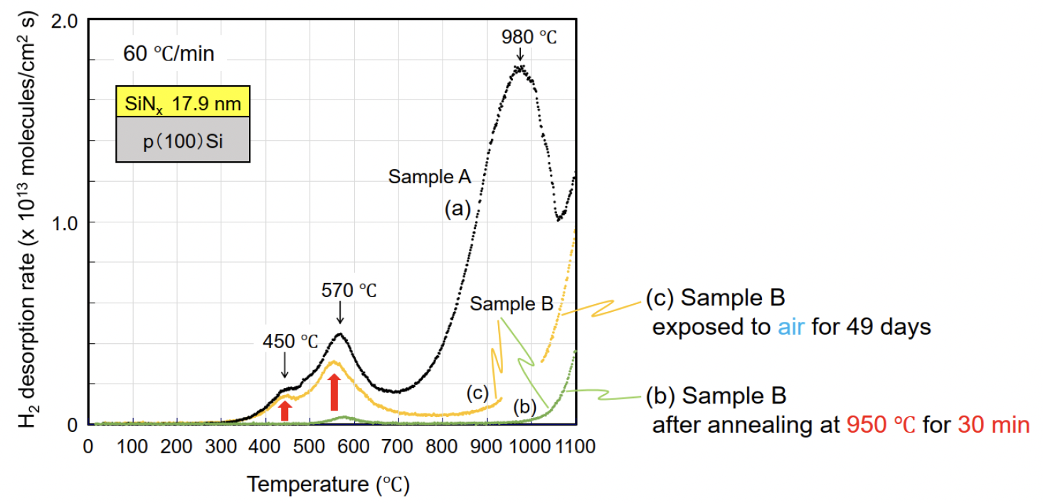 Using an infrared-heating TDS system (Model: ESCO-TDS1200II IR), we evaluated hydrogen desorption in SiNx thin films. Three H2 desorption peaks were observed at 450 °C, 570 °C, and 980 °C. The low-temperature peaks are consistent with surface-origin species on the native oxide (H2O or H), whereas the high-temperature peak reflects bulk hydrogen (N–H and Si–H). These results provide actionable guidance for pre-clean, deposition, and annealing optimization.