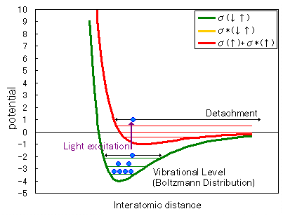 When vacuum ultraviolet light of a wavelength capable of causing electron transitions strikes this bond, the system transitions to a state where one electron occupies the bonding orbital and one occupies the antibonding orbital (Figure 1, red potential curve).
