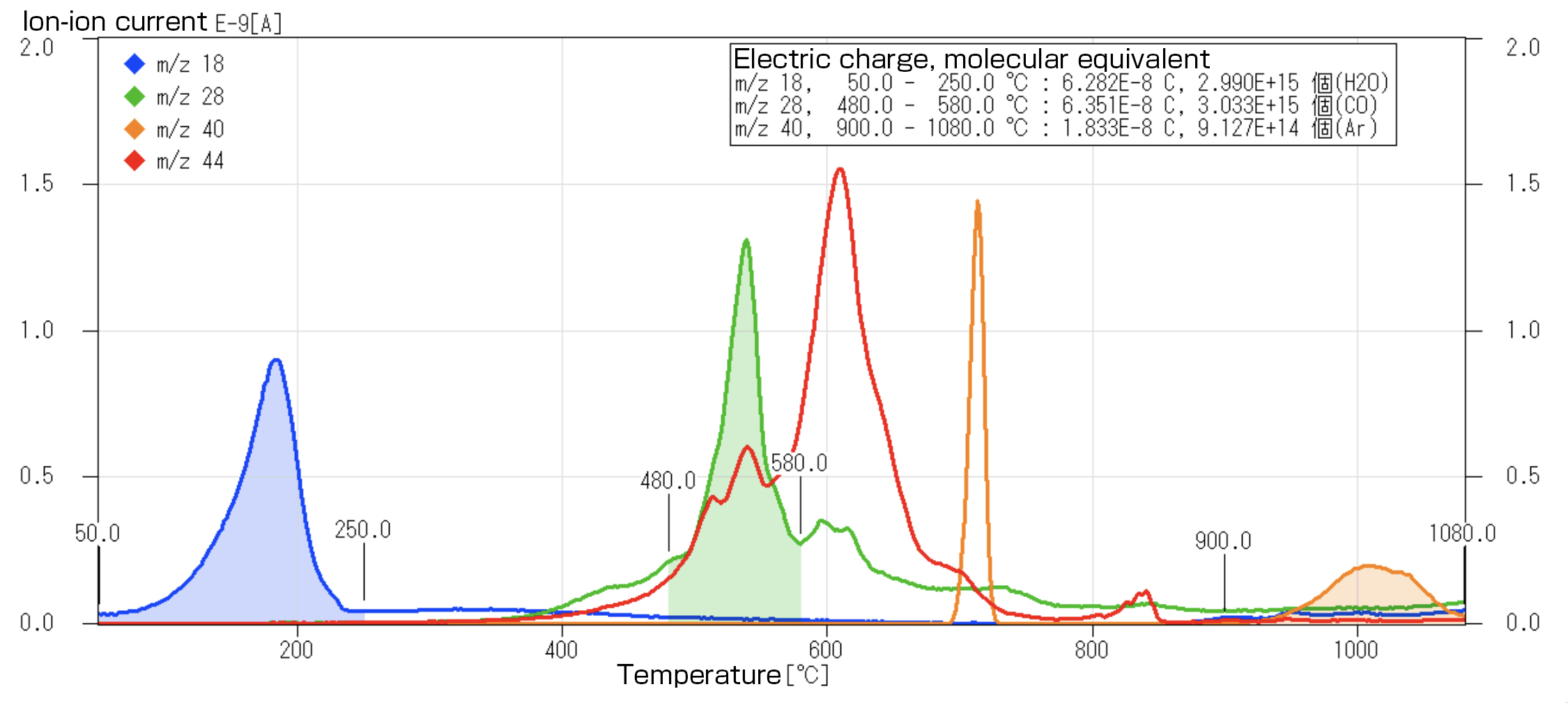 Since ion current and partial pressure are proportional in a mass spectrometer, the ion current ultimately becomes proportional to the desorption rate. Therefore, the total desorbed amount can be calculated from the area intensity obtained by integrating the ion current.