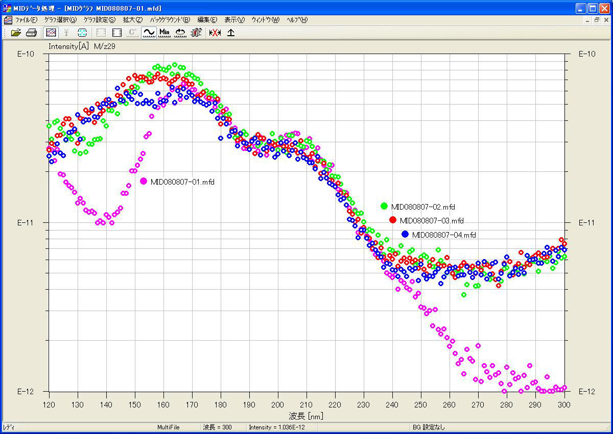 图3同样是PMMA薄膜在室温下的光脱附数据。该数据是在将单个样品置于超高真空环境中静置的条件下,反复进行光脱附实验所得。仅首次实验数据呈现出不同的信号形态。