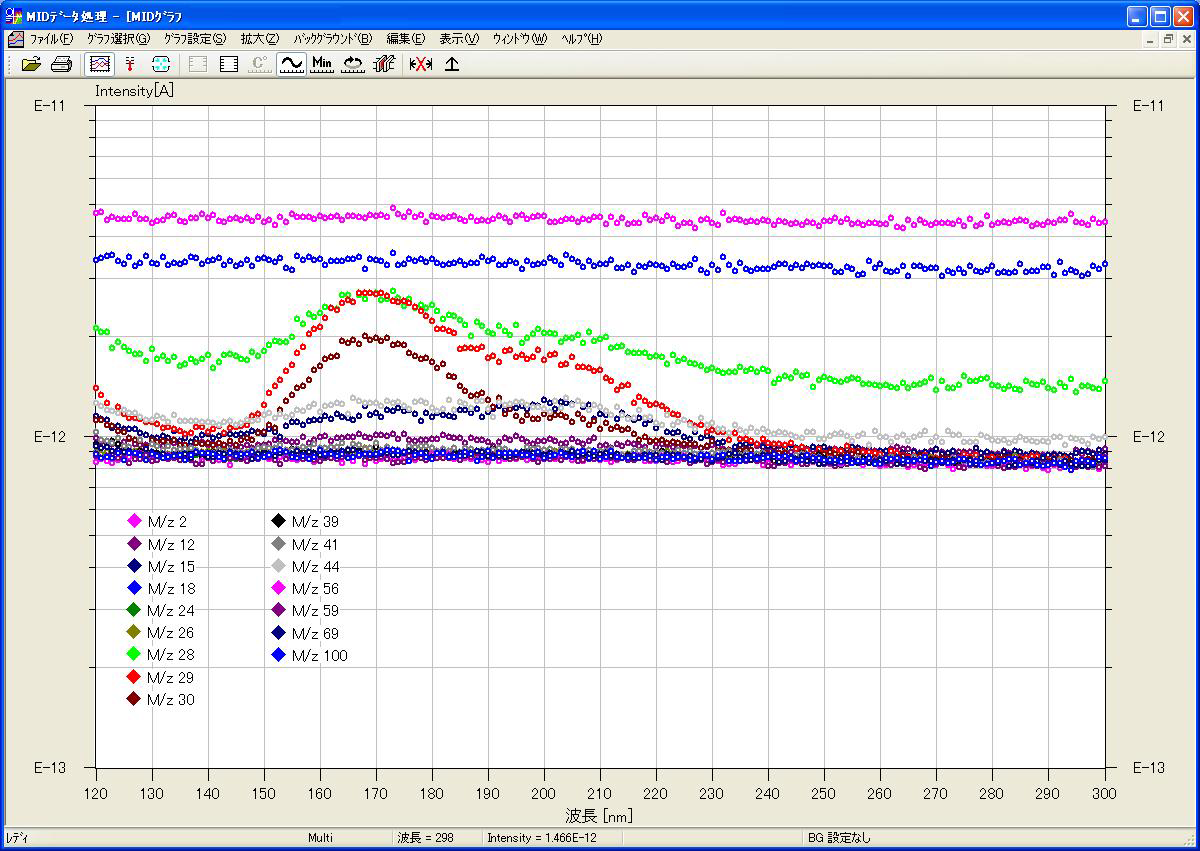 为验证装置原理,我们实施了PMMA(聚甲基丙烯酸甲酯,即亚克力)的光脱附实验。本实验旨在确认样品吸收光线后,不同波长会导致不同成分脱附的现象。